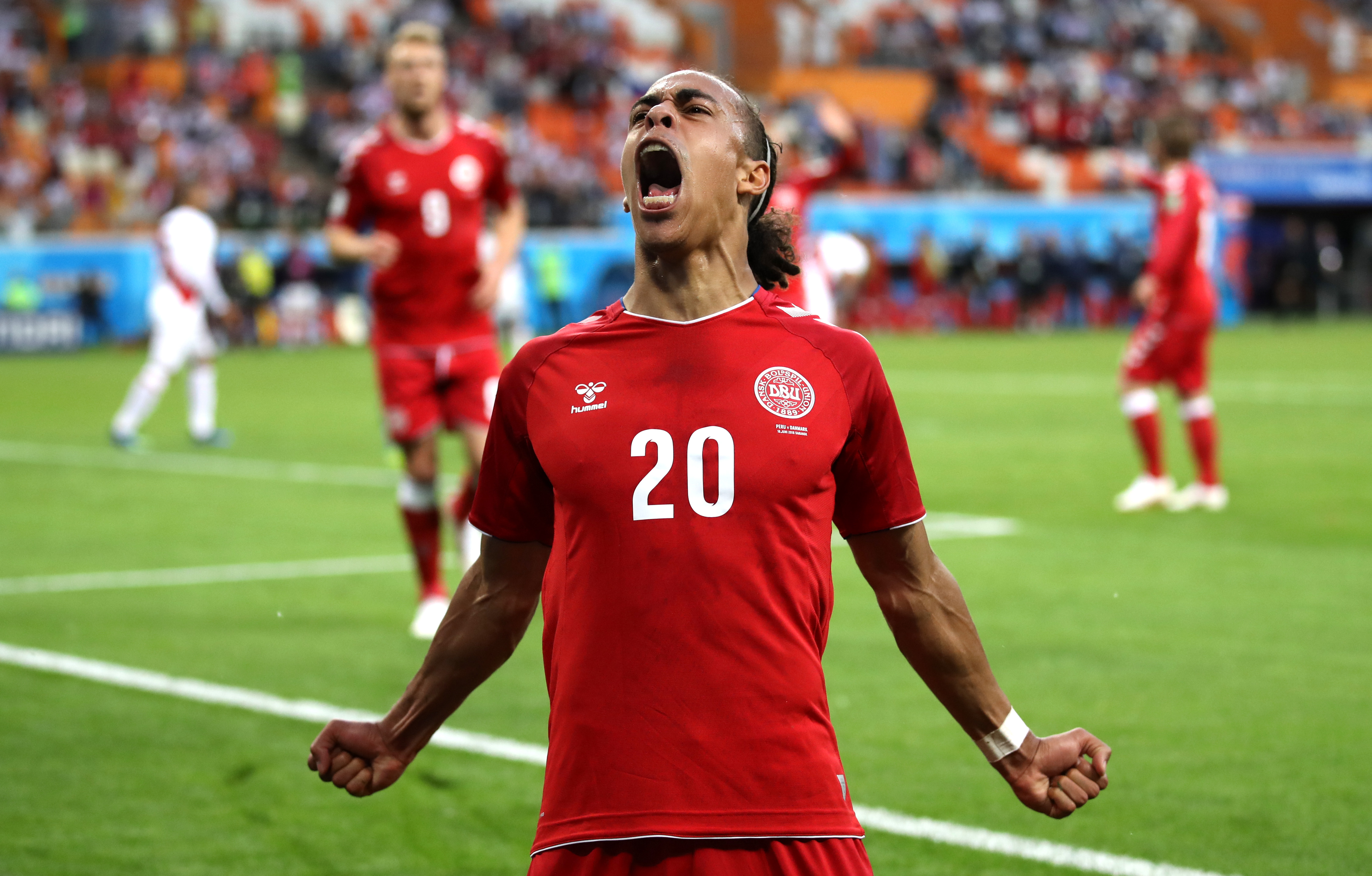 Los jugadores daneses celebran el gol 1-0 del delantero danés Yussuf Yurari Poulsen durante el partido #Per-#Den, del Grupo C del Mundial de Fútbol de Rusia 2018, en el Mordovia Arena de Saransk, #Rusia2018 #MundialRusia2018 pic.twitter.com/bgLgb77P57