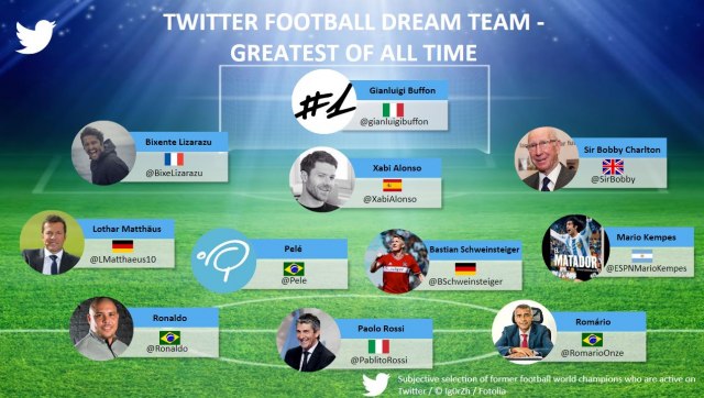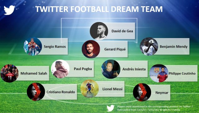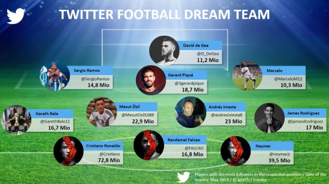 Ovo je "prvi tim" s obzirom na broj pratilaca na Tviteru: De Hea – Ramos, Pike, Marselo – Rodriges, Inijesta, Ezil, Bejl – Nejmar, Ronaldo, Falkao.