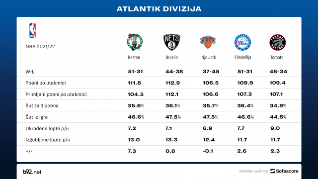 Da počnemo sa predstavljanjima, prva na redu nam je Atlantik divizija, marketinški najisplativija i divizija koja je prepuna lepe košarkaške istorije, a nju čine: Njujork Niksi, Bruklin Netsi, Filadelfija Seventisiksersi, Boston Seltiksi i Toronto Reptorsi.