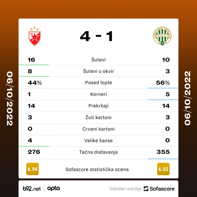 Fudbaleri Crvene zvezde pobedom nad Ferencvarošem (4:1) ostali su u trci za evropsko proleće.