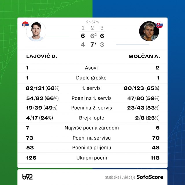 Ipak, u odlučujućem, ključni brejk Lajović je načinio u šestom gemu, kada je iskoristio četvrtu šansu da oduzme servis protivniku.