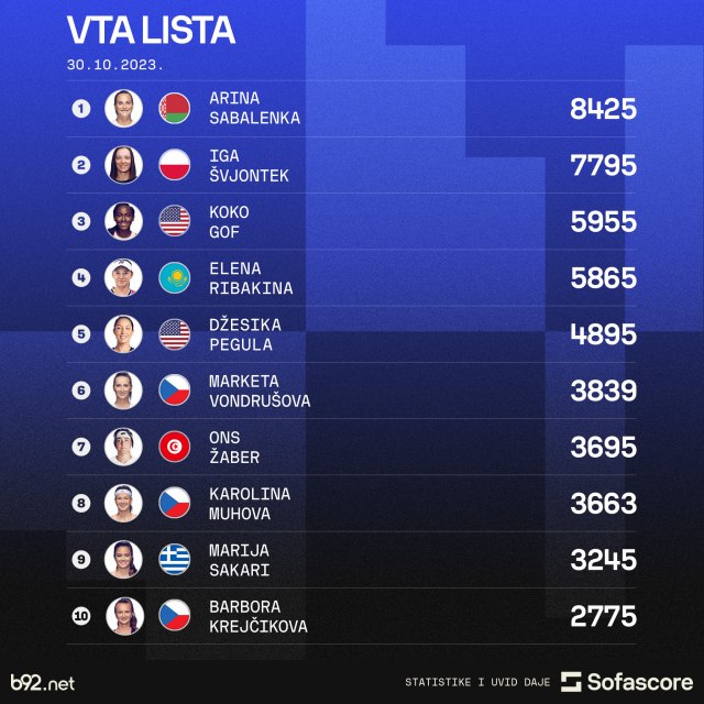 Sabalenka predvodi najbolje teniserke na svetu sa 8,425 bodova, prati je Poljakinja Iga Švjontek sa 7,795, a treća i dalje Amerikanka Koko Gof sa 5,955 poena.