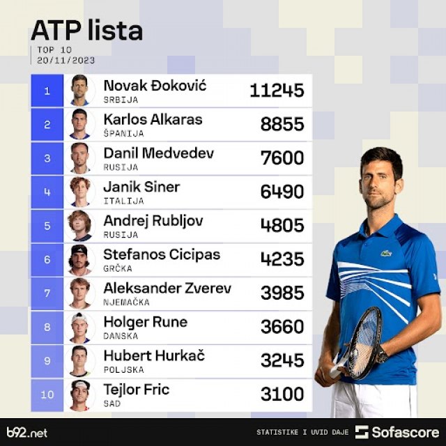 Drugi je Španac Karlos Alkaras sa 8.8855 bodova, dok je treći Rus Danil Medvedev (7.600).