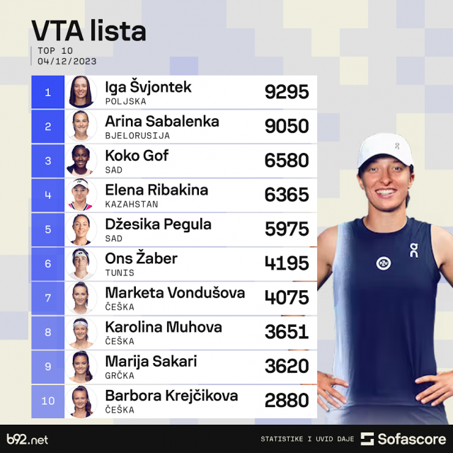 Treća je Amerikanka Koko Gof sa 6.580, četvrta Elena Ribakina (Kazahstan) sa 6.365, a peta Amerikanka Džesika Pegula sa 5.975. bodova.