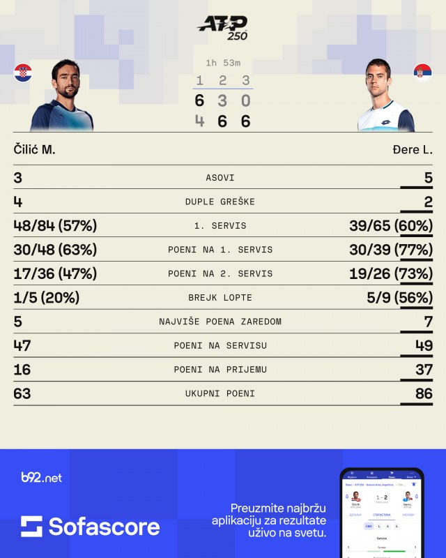 Meč Đerea i Čilića, 35. i 1044. tenisera sveta, trajao je skoro dva sata.