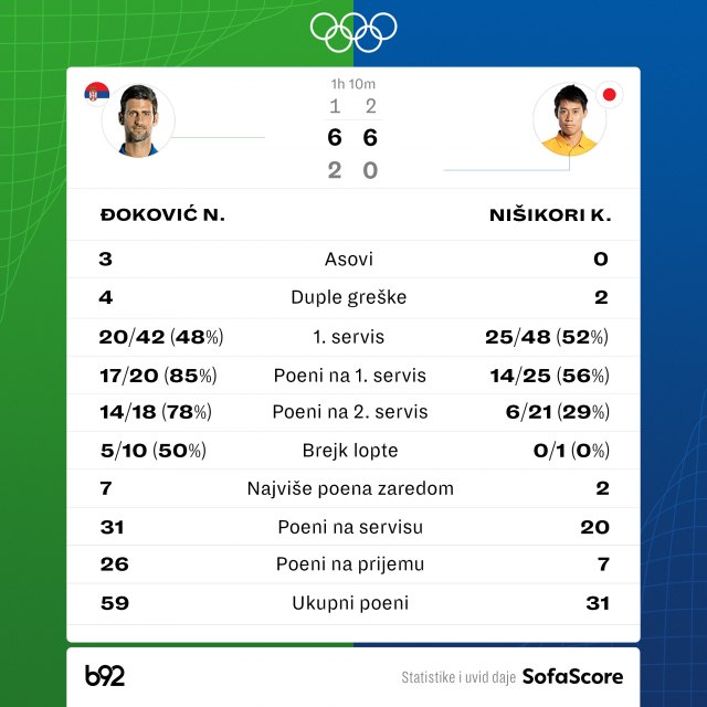 Najbolji teniser sveta je posle 70 minuta igre pobedio 69. igrača sveta, Japanca Keija Nišikorija 6:2, 6:0.