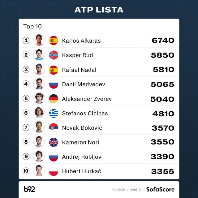 Četvrti je Danil Medvedev koji je izgubio 1.820 bodova, dok potom slede Aleksander Zverev sa 5.040 i Stefanos Cicipas sa 4.810 koji je prestigao Novaka Đokovića.
