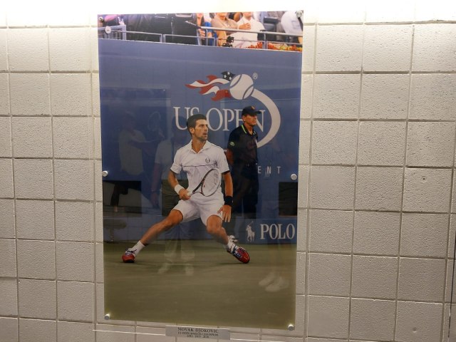 Odmah je tu i hodnik, u kojem se nalaze velike slike šampiona, među njima i Novakova. Na kraju, na poslednjim, pre izlaska na teren su Federerova i Alkarasova.