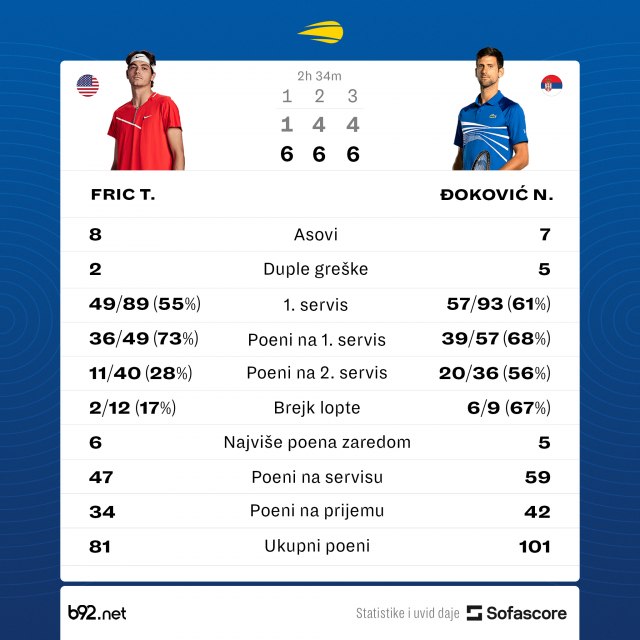 Bio je to njihov osmi duel i osma pobeda Đokovića, a u polufinalu će igrati protiv još jednog domaćeg tenisera. Da li će to biti Frensis Tijafo ili Ben Šelton znaće se posle njihovog okršaja u večernjem terminu.