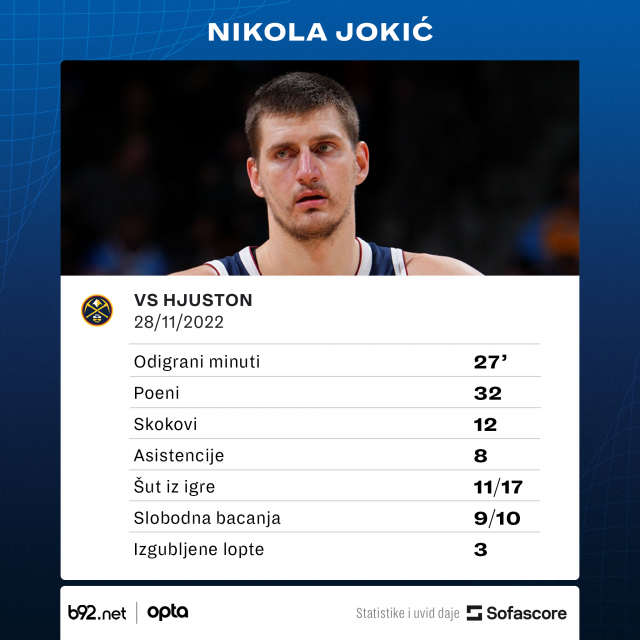 Dvostruki MVP Nikola Jokić imao je još jednu sjajnu partiju i u pobedi Denvera nad Hjustonom učestvovao sa 32 poena, 12 skokova i 8 asistencija.