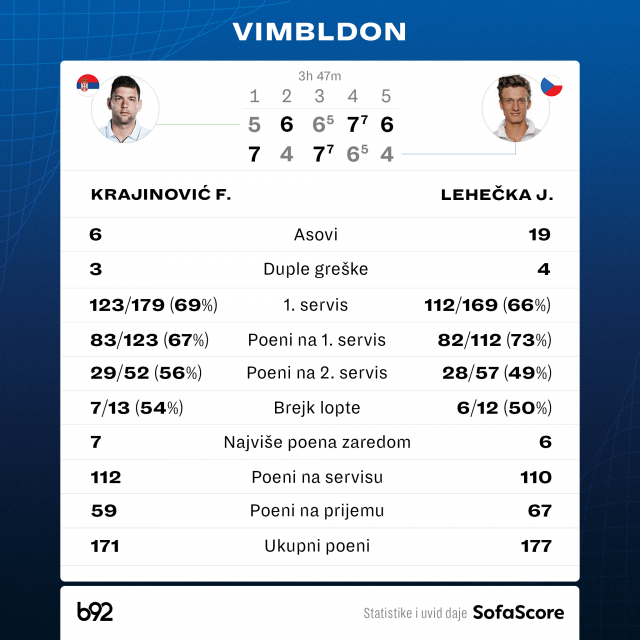 Suočavali su se obojica sa brejk loptama u četvrtom setu, nekako odolevali, da bi u devetom Lehečka doveo Filipa na rub poraza.