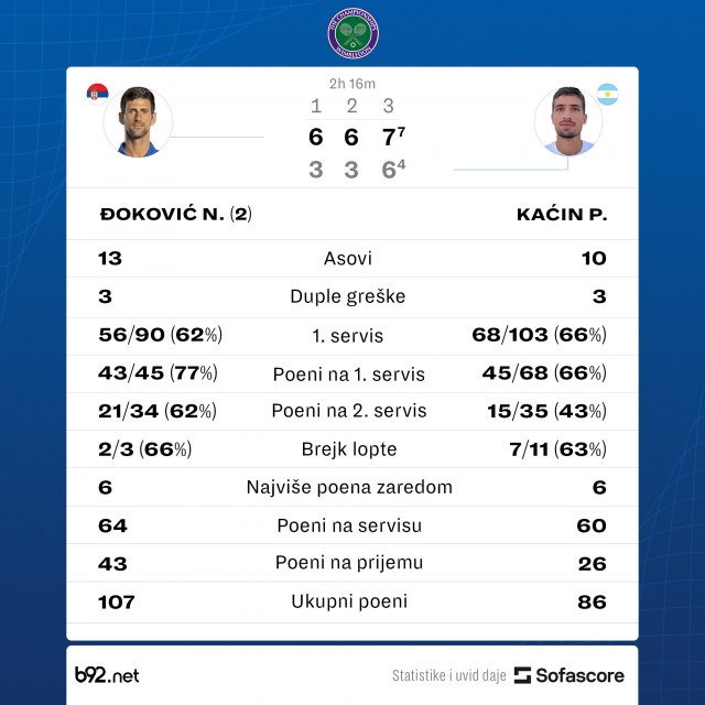 Kaćin nije mogao da pripreti kada je Novak bio na servisu, pa je Novak samo ubrzao u finišu drugog seta i u devetom gemu stigao do novog brejka, 6:3 i velikih 2-0 u ovom meču.