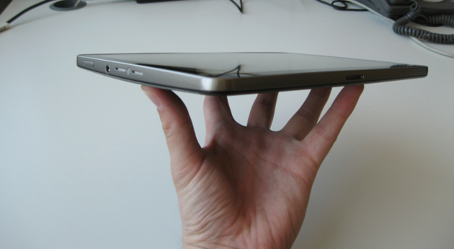 Ekran je standardne dijagonale i rezolucije (10,1 inč, 1280x800 piksela), ali je zahvaljujući veoma tankom pojasu koji ga okružuje uređaj izuzetno optimalnih dimenzija (246mm x 170mm x 10,9mm), što je u poređenju sa Honeycomb tabletima koje smo imali prilike da probamo sa nijansu manje od Xooma i za nešto veću nijansu (čitavih 2cm kraći, 1cm uži i 2mm tanji) manje od Transformera. Ovakve dimenzije uz prijatnu pozadinu 10.1v čine izuzetno lakim i prijatnim za korišćenje.
