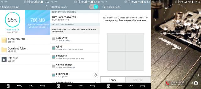 Naročito zgodne i korisne stvari koje LG isporučuje u okviru "svog" Androida tiču se otključavanja ekrana. Pre svega, ekran je moguće probuditi dvostrukim tapom na isključeni ekran. Kada to uradite otključavanje se nastavlja nekom od klasičhim metoda. Sve to, opet, moguće je zameniti nečim što LG zove "Knock Code".
