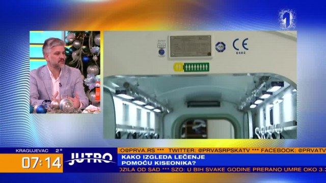 "Hiperbarična komora je uređaj gde se sprovodi hiperbarična oksigenacija medicinskim kiseonikom. Tom prilikom postižemo povišeni pritisak i pacijenti udišu stoprocentni kiseonik. Potreban je adekvatan pritisak, preko 2 bara, i čist kiseonik koji pacijenti dobijaju preko maske ili se komore pune kiseonikom", kaže za TV Prva specijalista pomorske medicine dr Branko Markuš.