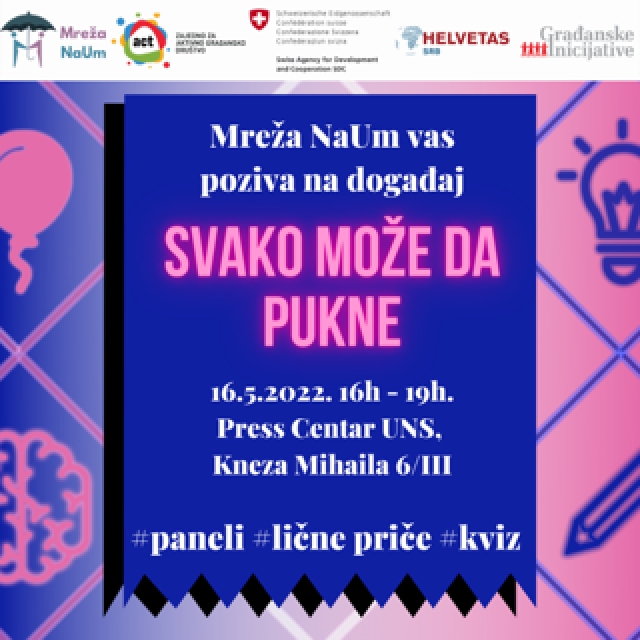 Mreža za mentalno zdravlje NaUm predstaviće aktuelni projekat Svako može da pukne i izneti rezultate anonimnog upitnika o mentalnom zdravlju. Upitnikom smo želeli da steknemo uvid u izazove sa kojima se suočavaju osobe sa problemima mentalnog zdravlja, a rezultati ovog istraživanja koristiće se u svrhu kreiranja preporuka prema donosiocima odluka radi unapređenja politika u oblasti mentalnog zdravlja, rekla je Larisa Despotović, koordinatorka projekta i predsednica Udruženja Herc, nosioca projekta Svako može da pukne.