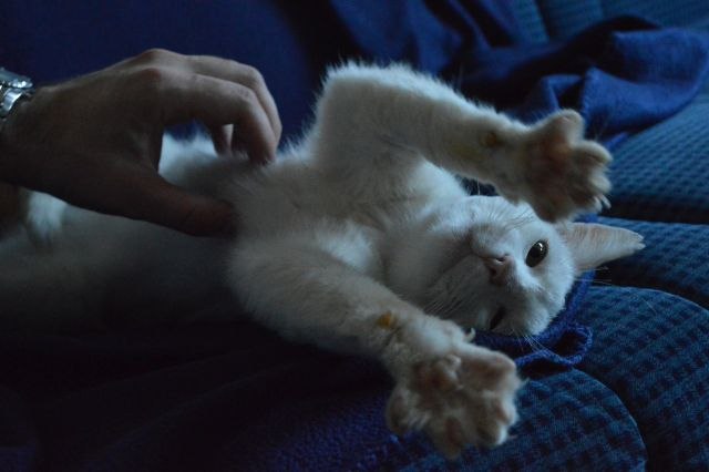 Ovaj neodoljivi snežno beli mačak ima dva mačija virusa (FIV – mačiju sidu i FELV – mačiju leukemiju). Ovi virusi nisu isti kao kod ljudi, a takođe nisu ni zarazni za ljude, kao ni za druge životinje osim za mačke (prenose se pljuvačkom ili ukoliko mace jedu iz iste posude za hranu). Ima slučajeva gde mačke sa ovim virusima žive i po 20 godina, ali u stanu gde nemaju svakodnevni stres od nedostatka hrane i vode, opasnosti od drugih životinja, automobila, neosvešćenih ljudi itd.