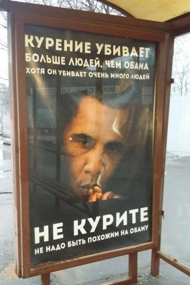 Dmitri jGudkov, liberal iz ruskog parlamenta, u utorak je postavio fotografiju sa jedne moskovske autobuske stanice, na kojoj se vidi američki predsednik Barak Obama kako puši cigaretu. Pored fotografije nalazi se natpis: „Pušenje ubija veći broj ljudi nego Obama, iako on ubija mnogo. Nemojte pušiti, ne budite kao Obama“.