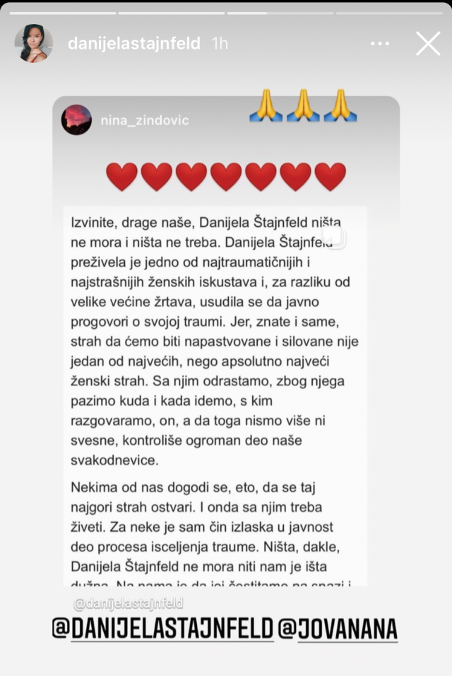 "Izvinite, drage naše, Danijela Štajnfeld ništa ne mora i ništa ne treba. Danijela Štanjfeld preživela je jedno od najtraumatičnijih i najstrašnijih ženskih iskustava i za razliku od velike većine žrtava, usudila se da javno progovori o svojoj traumi", navodi se u postu.