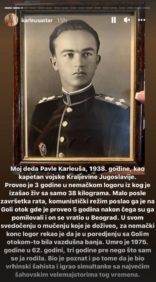 Moj deda, Pavle Karleuša, 1938. godine kao kapetan vojske Kraljevine Jugoslavije. Proveo je tri godine u nemačkom logoru iz kog je izašao živ sa samo 38 kilograma - napisala je Jelena, a zatim dodala: