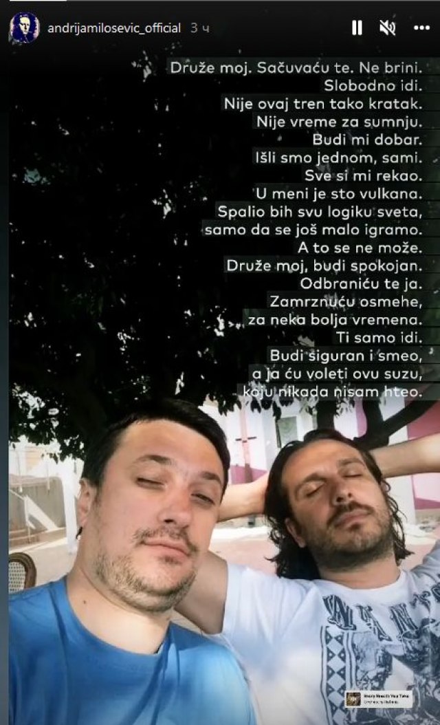 "Druže moj. Sačuvaću te. Ne brini. Slobodno idi. Nije ovaj tren tako kratak. Nije vreme za sumnju. Budi mi dobar. Išli smo jednom, sami. Sve si mi rekao. U meni je sto vulkana. Spalio bih svu logiku sveta, samo da se još malo igramo. A to se ne može. Druže moj, budi spokojan. Odbraniću te ja. Zamrznuću osmehe, za neka bolja vremena. Ti samo idi. Budi siguran i smeo, a ja ću voleti ovu suzu, koju nikada nisam hteo", napisao je on u pričama na Instagramu.
