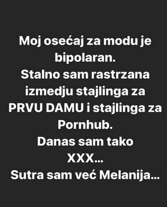 "Moj osećaj za modu je bipolaran. Stalno sam rastrzana između stajlinga za prvu damu i stajlinga za Pornhub. Danas sam tako XXX... Sutra sam već Melanija"