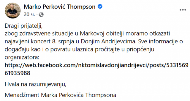 Nakon što je pevač Marko Perković Tompson na svojoj službenoj stranici na Fejsbuku fanove obavestio da zbog zdravstvene situacije u porodici neće nastupiti u Donjim Andrijevcima, na internetu je počela da kruži vest da je njegov 17-godišnji sin završio u bolnici zbog zastoja srca. Pevač zasad nije potvrdio tu informaciju, a hrvatski mediji još nisu dobili zvanične informacije od pevača.