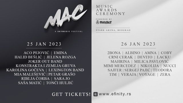 Beogradska Štark Arena za tačno nedelju dana biće epicentar muzičkog dešavanja i to u okviru Music Awards Ceremony (MAC) powered by MaxBet, regionalnoj ceremoniji dodele muzičkih priznanja koju organizuje Skymusic. Najveće muzičke zvezde regiona nastupiće 25. i 26. januara, a pripreme za najspektakularniji događaj uveliko traju! Interesovanje publike je ogromno, zbog veoma ograničenih količina ulaznica za nivo 200, od juče je u prodaju pušten i nivo 400. Ulaznice su dostupne putem efinity.rs, aplikacije e_Finity, u TC Rajićeva i na blagajni Štark Arene.