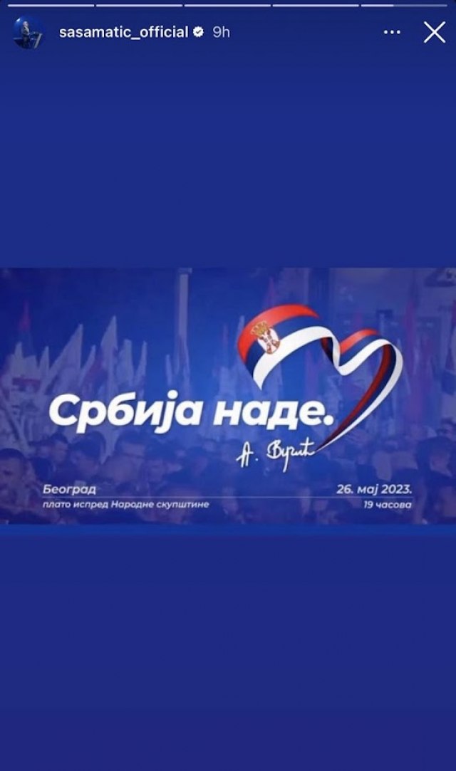 Poznati pevač Saša Matić pozvao je građane da pruže podršku predsedniku Aleksandru Vučiću na velikom mitingu zakazanom u petak 26. maja.