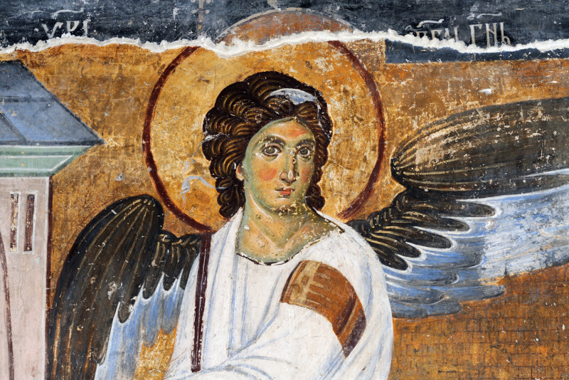"Beli anđeo je freska koja je naslikana između 1222. i 1235. u 13. veku. U jednom periodu je bila prekrivena slojem iz 16. veka, što ju je sačuvalo do 1863. kada je otkrivena u obnovi Mileševe. Beli anđelo je Arhangel Gavrilo koji sedi na velikom kamenu odvaljenom od groba i pokazuje ženama mironosicama da je grob prazan i da je Gospod vaskrsao i vaskrsenjem smrt pobedio i nama darovao život i priliku da iskoristimo za svoje spasenje. Ispod njegovih nogu su prikazani vojnici koji su bili zaduženi da čuvaju grob", objašnjava mati Paraskeva.