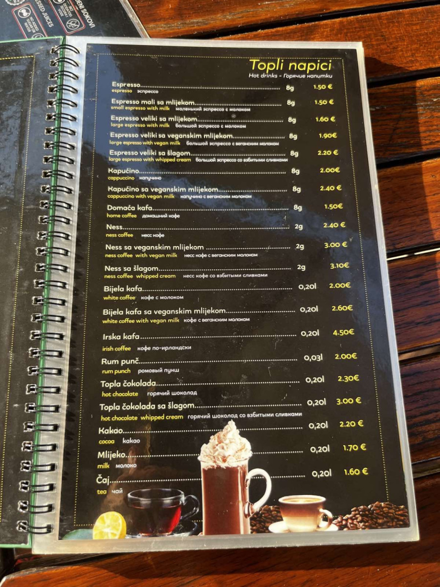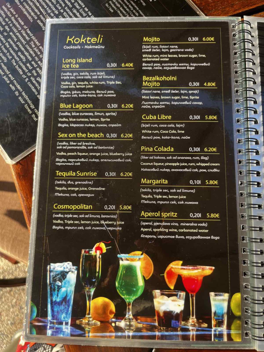 U srcu Starog grada Budve, gde se očekuju više cene zbog prestiža lokacije, situacija je i dalje pristupačna: pivo oko 3 evra, sok 2,50, a kafa samo 1,80.