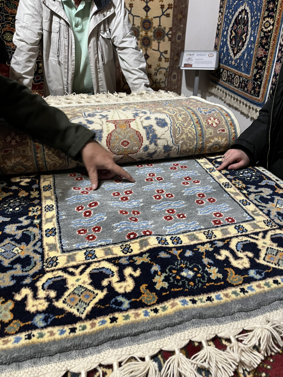 Plavi tepih nosi vrlo zanimljivu priču. Budući da su žene uglavnom izrađivale tepihe, ovaj tepih je poseban po tome što su ga radili muškarci koji su služili zatvorsku kaznu, kako bi bili uposleni. Zbog činjenice da su ga izradili muškarci, što je izuzetna retkost, bio je više vrednovan od onih koje su izrađivale žene.