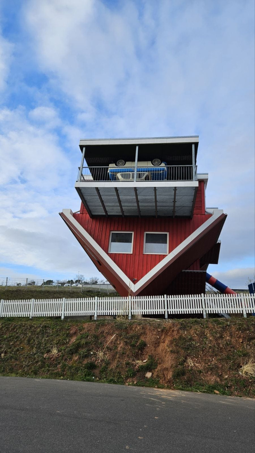 Deluje nestvarno, ali nisu u pitanju posledice nikakvog olujnog nevremena već su entuzijasti iz ove zemlje odlučili da naprave specifičnu turističku atrakaciju, i u tome su uspeli. Kuća okrenuta naopačke privlači veliku pažnju vozača i turista.