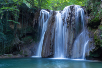 Voda koja se sliva niz stene formira malo jezero neobične, zelenkasto-plave boje, dok okolna šuma pojačava osećanje mira i izdvojenosti od svakodnevice.