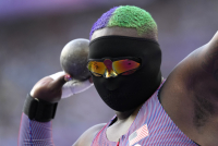 More gender madness at the Olympics in the women’s shot put. The host introduces Raven Saunders, saying “it’s good to see her back”.