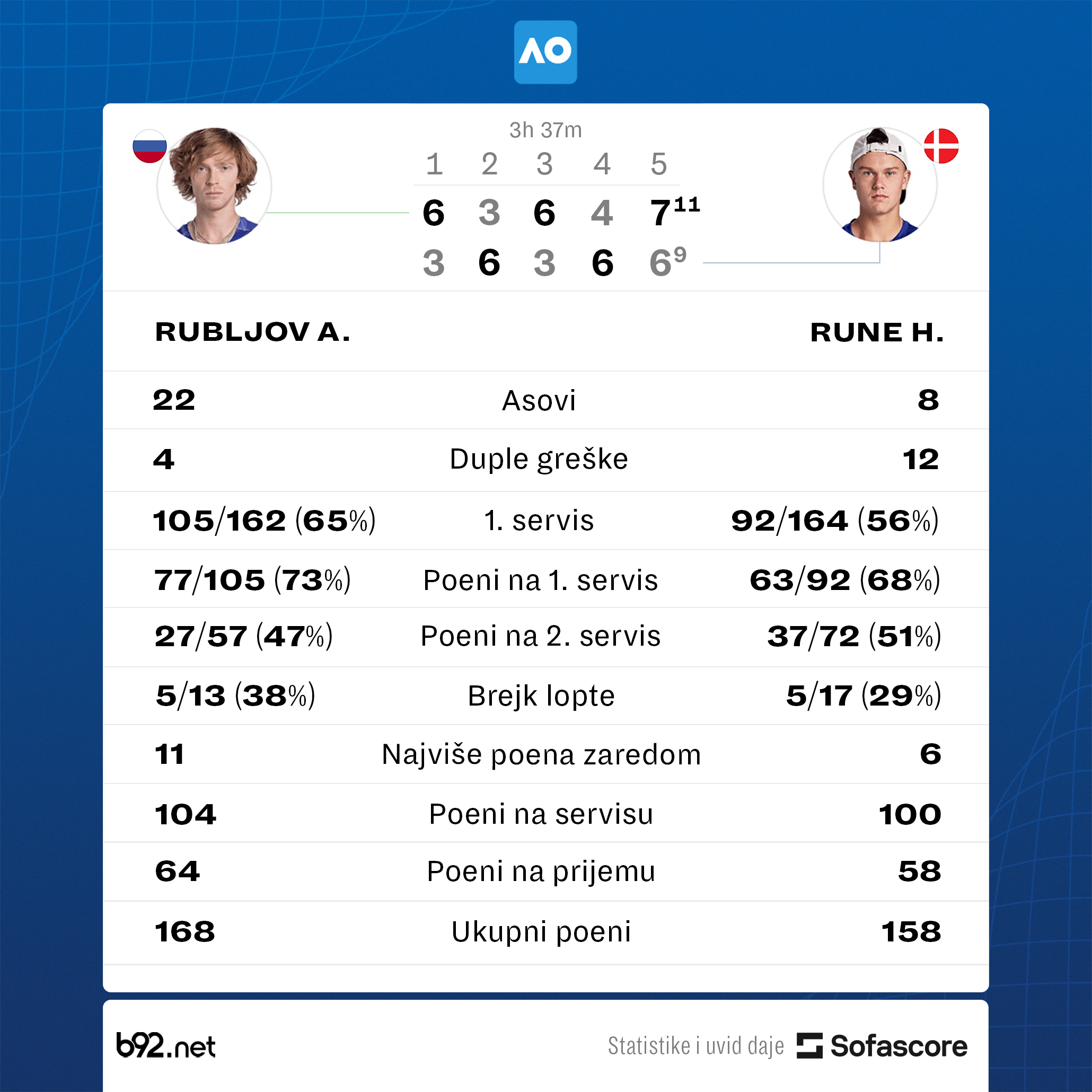 Poveo je sa 5:2, Rubljov je vratio brejk i smanjio na 5:4, ali je na set loptu Runea u desetom gemu poslao loptu u aut pa je sve rešeno u petom setu.