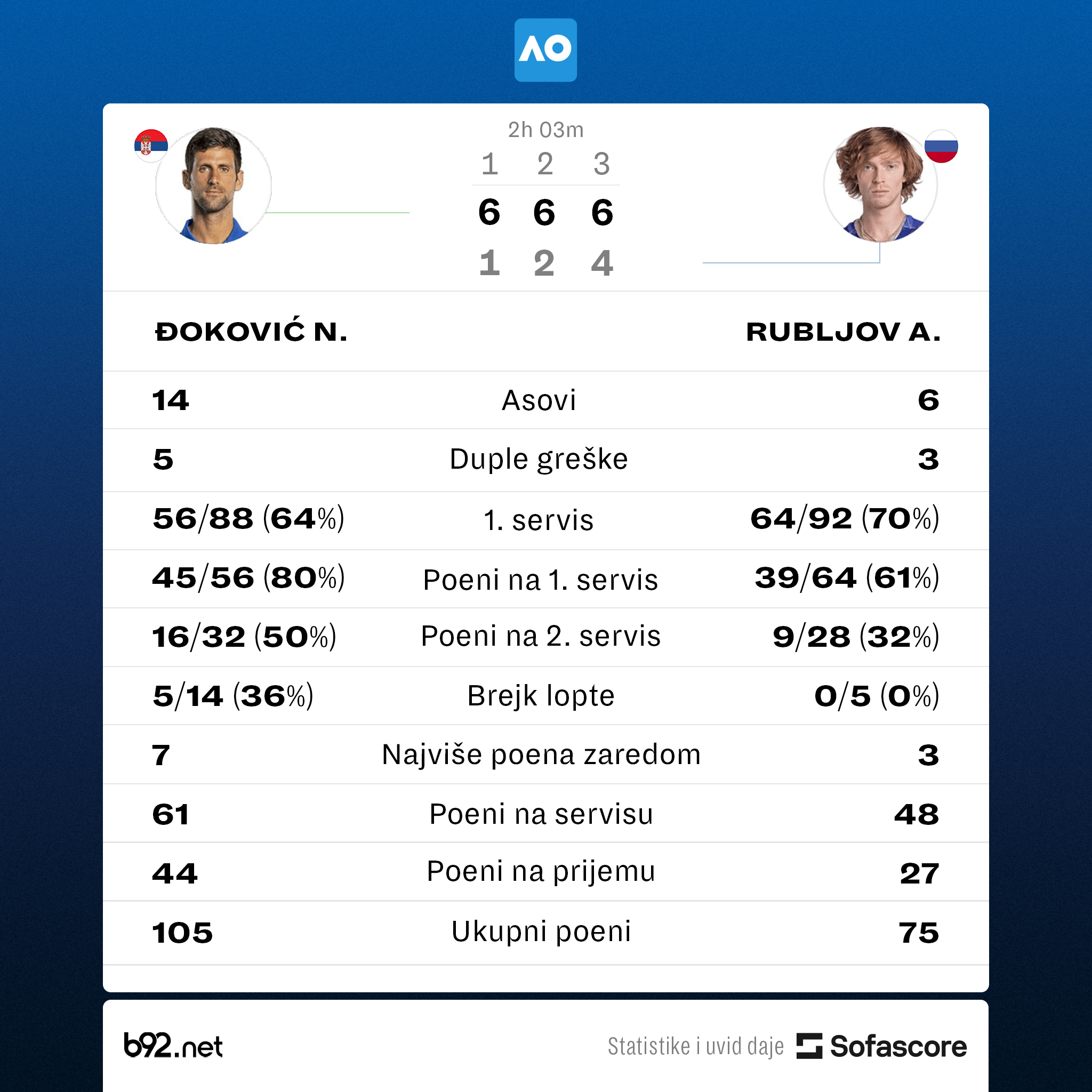 Naredni gem je potrajao više od osam minuta, imao je Rubljov šansu da vrati brejk, ali Novak je odoleo, iskoristio četvrtu loptu i posle 44 minuta igre dobio je i drugi set, 6:2.