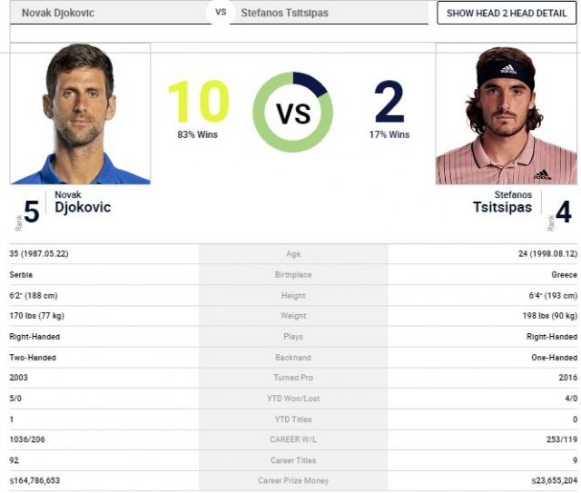 Cicipas je dobio dva od prva tri međusobna susreta, koje su igrali 2019. godine, ali od tada nema rešenja za Đokovića.