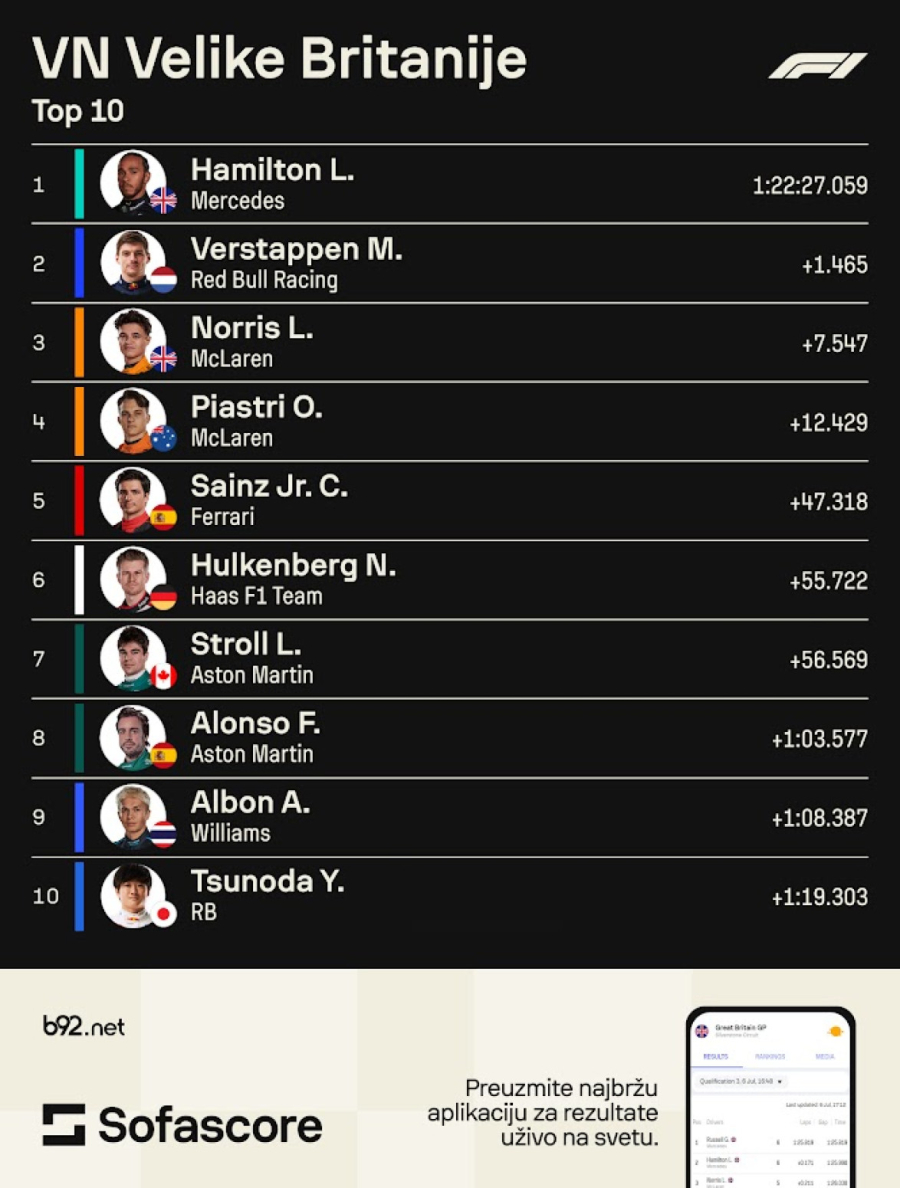 Na drugom mestu je trku završio Maks Ferstapen, dok je treći bio Lando Noris.