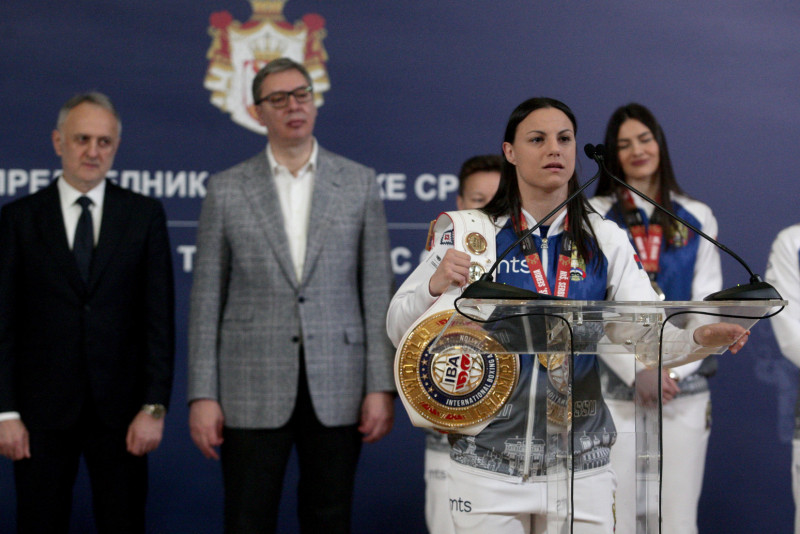 "Hvala, Anđela, za prvo svetsko zlato, hvala za težak životni put kroz koji ste prošli i opet bili spremni da se borite i uradite sve za svoju zemlju. Ispisale ste istoriju sprskog boksa, Hvala što nas učinile posebnim. Hvala što ste pokazale kako se bori u ringu, ali u životu. U četvrtak država isplaćuje novac - 30.000 evra za zlato i pet puta po 20.000 za bronzu. Nama ostaje da ulažemo u boks. Hvala vam svima. Želim vam mnogo uspeha u budćnosti. Čestitam, živela Srbija", dodao je Vučić.