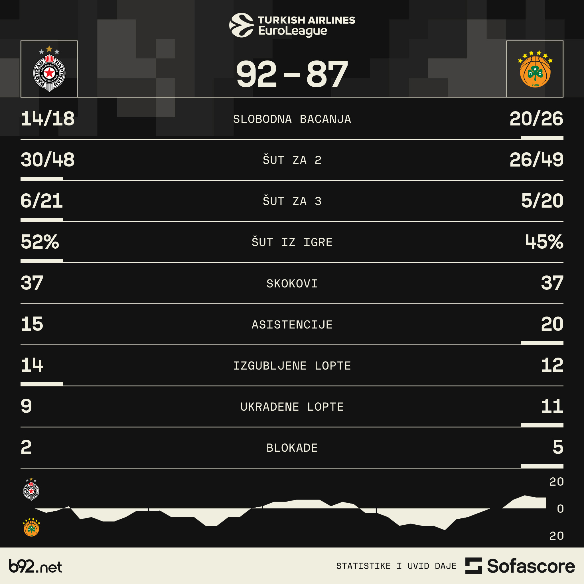 Rezultat na poluvremenu utakmice 11. kola Evrolige u Štark areni#KKPartizan 3️⃣9️⃣ - 3️⃣8️⃣ @paobcgr #EuroLeague #EveryGameMatters pic.twitter.com/jzS3Eu8133