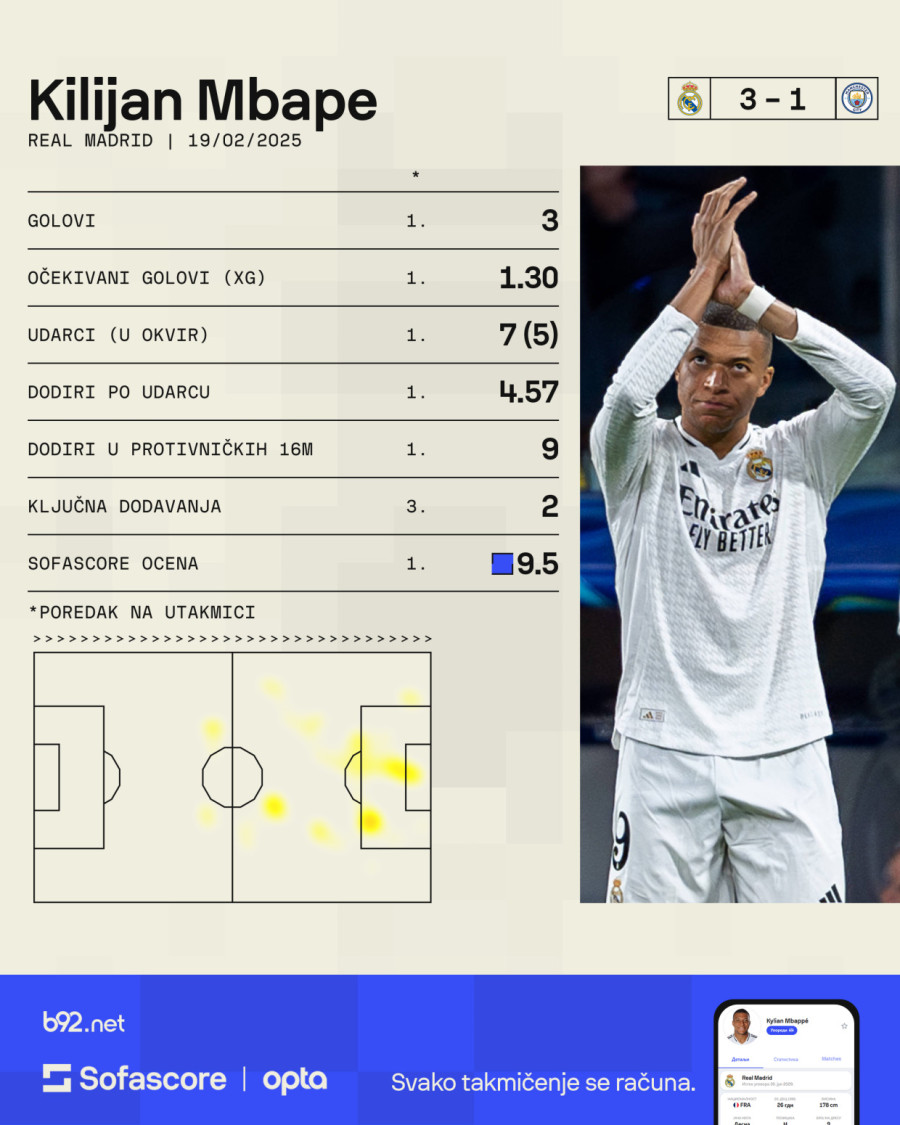 Mbape je postigao sva tri gola u pobedi svoje ekipe nad Mančester sitijem 3:1.