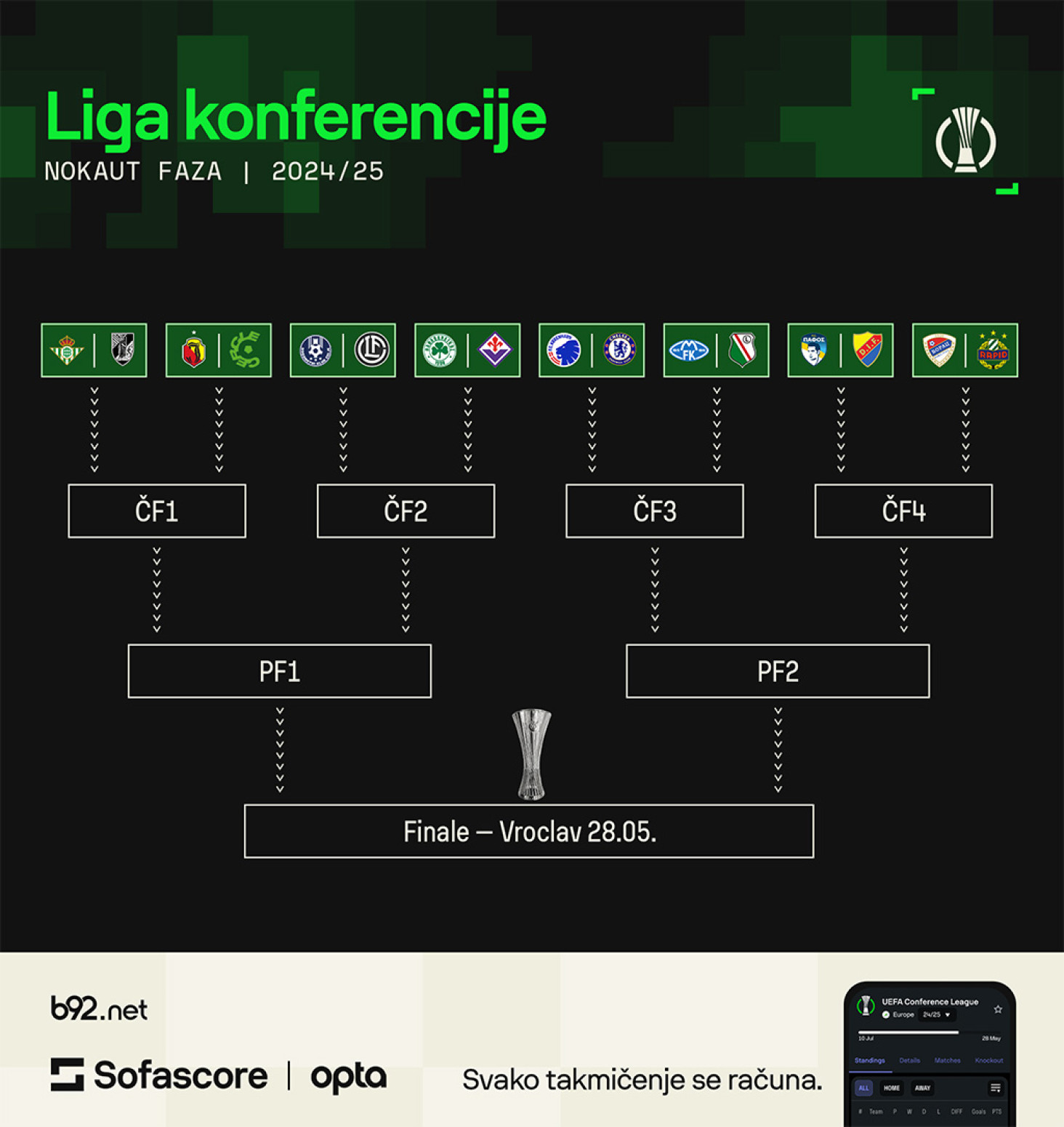 Četvrtfinalni dueli Lige konferencije igraće se 10. i 17. aprila, polufinalni 1. i 8. maja, dok je finale zakazano za 28. maj u Vroclavu u Poljskoj.