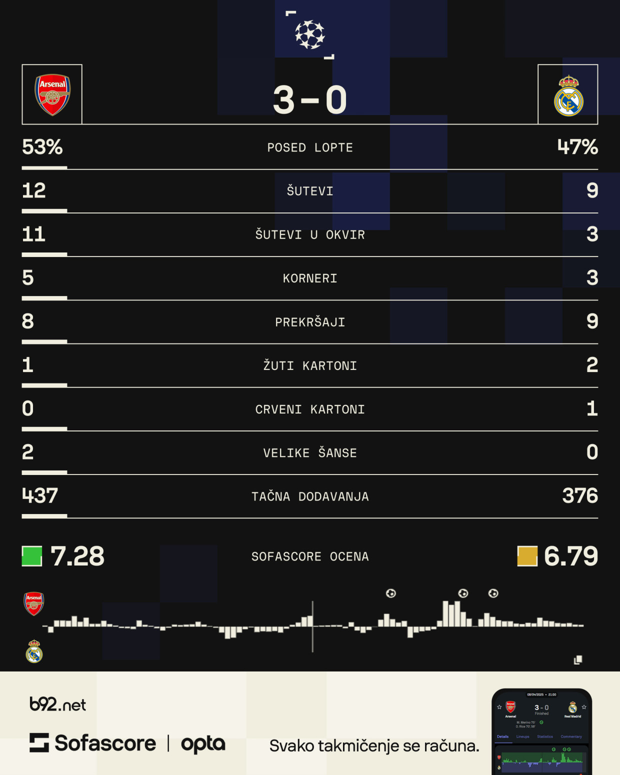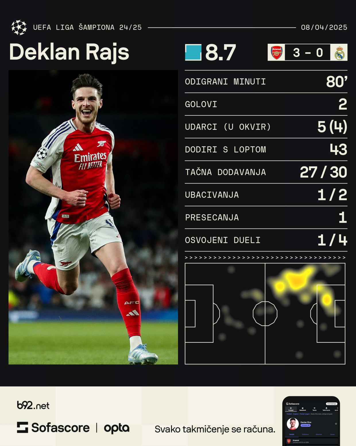 Pamtiće se dve bombe iz slobodnog udarca Deklana Rajsa, kojima je podsetio na golove Siniše Mihajlovića, te gol Mikela Merina kojim je dotukao "svoje" Špance.