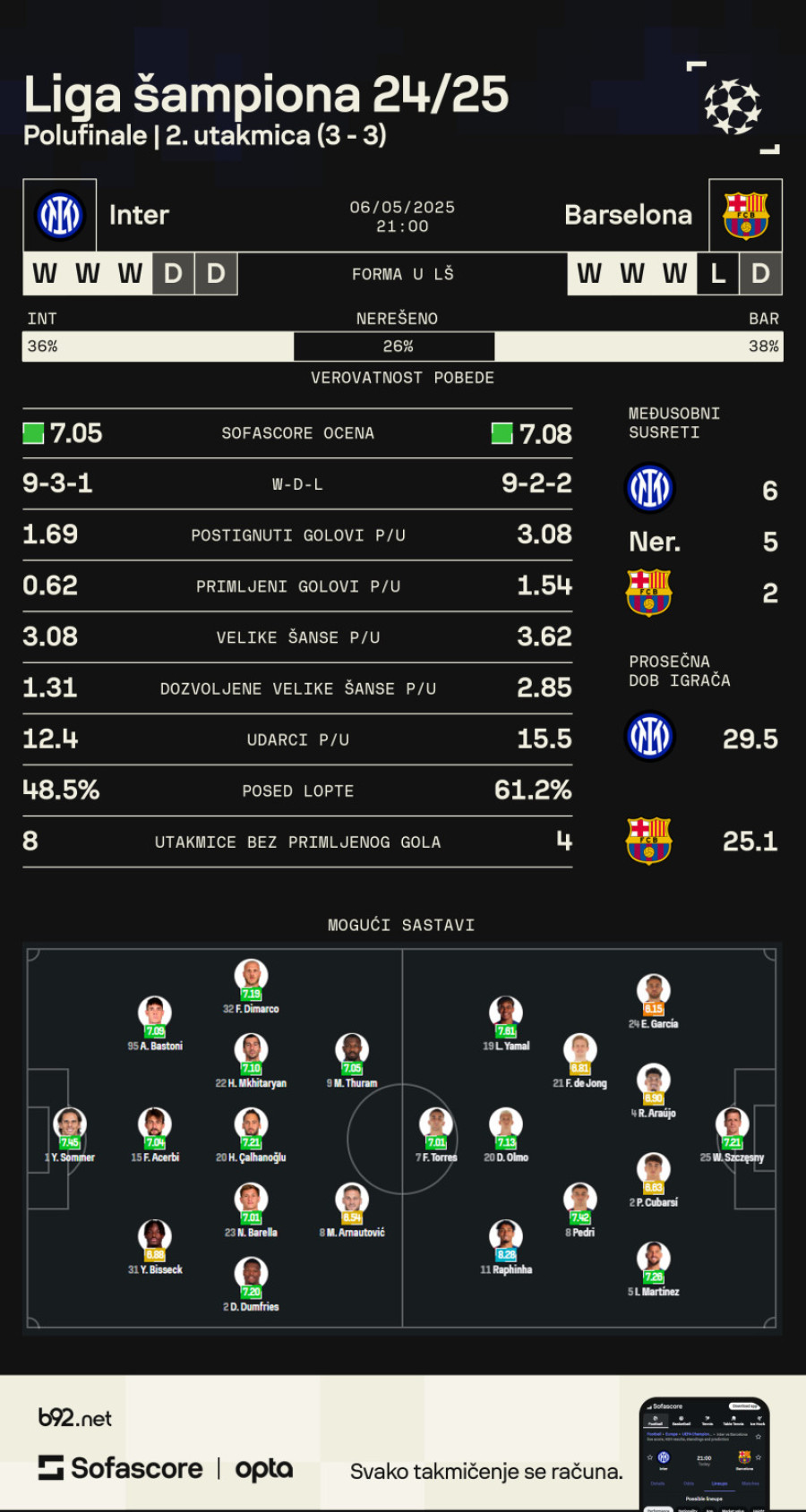 Sve ukazuje na to da nas čeka najmanje 90 minuta apsolutnog spektakla između da fudbalska titana – Intera i Barselone.