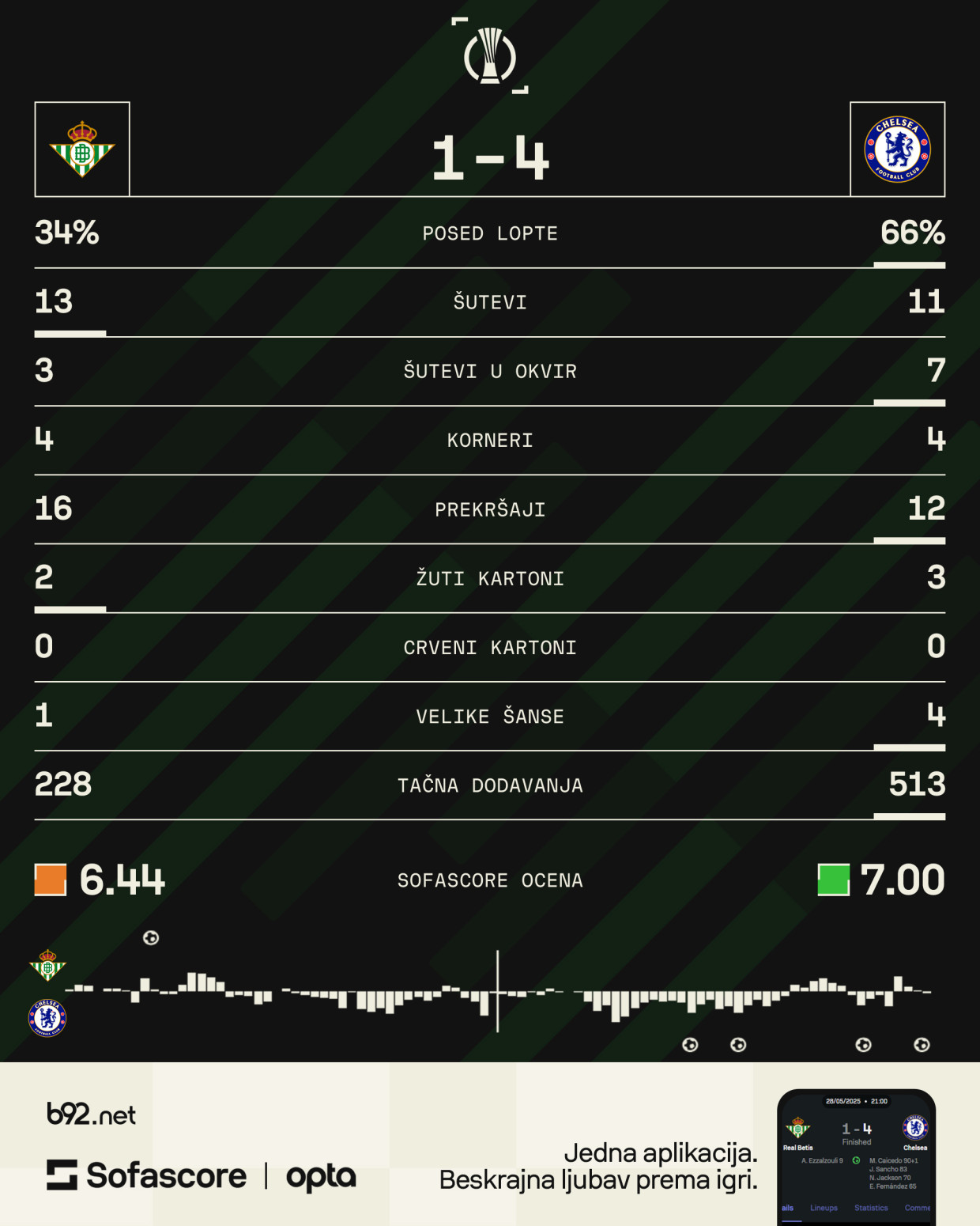 Betis se nakon toga potpuno "raspao", više nije bio toliko konforan u svom defanzivnom pristupu, a individualni kvalitet Čelsija je maksimalno došao do izražaja.