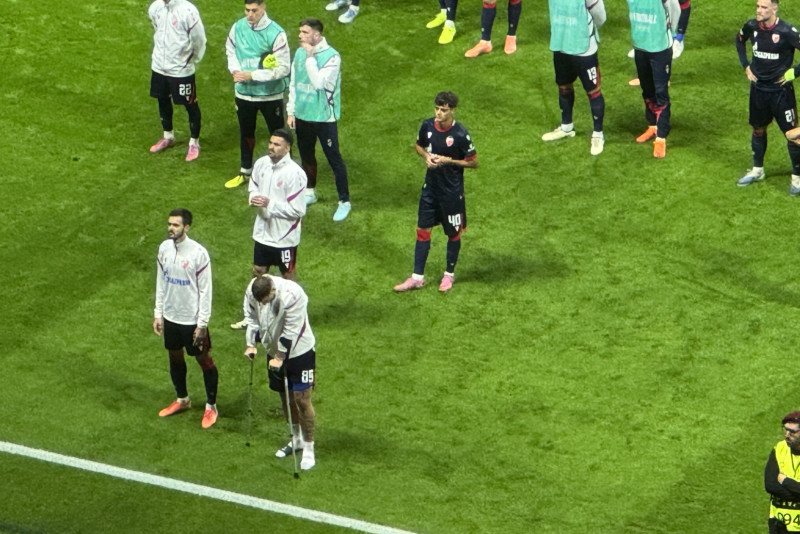 Kako naš novinar sa lica mesta, Milan Tomić, javlja: Marko Arnautović je izašao na teren sa saigračima kako bi pozdravio navijače, ali na štakama.
