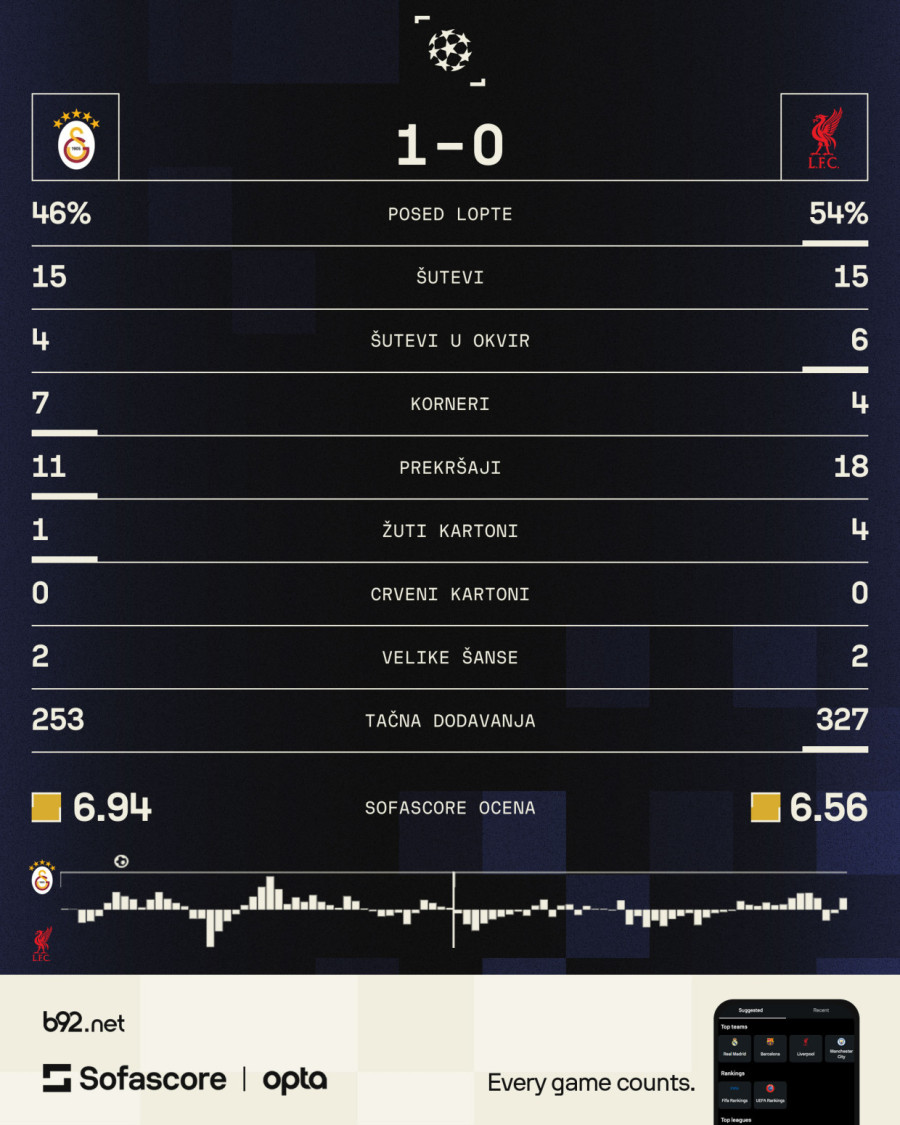 Galatasaraj je imao nekoliko velikih šansi u prvom poluvremenu, ali je i Liverpul uspevao da zapreti, da bi tek u drugom poluvremenu videli velike stvari.