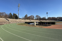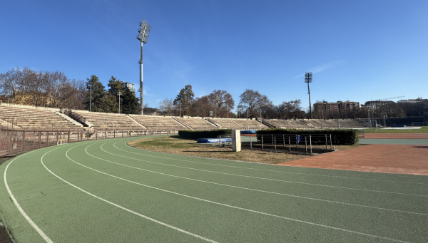 Izbijate na atletsku stazu, gde treniraju rekreativci i profesionalci. Teren okružuju betonske, dotrajale tribine, ali i terasa sa pomoćnom zgradom i prepoznatljivim stubovima, moram priznati, ne znam kog stila.