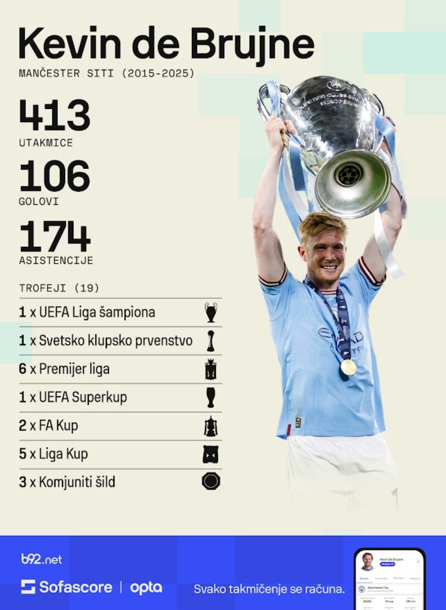 "Fudbal me je doveo do svih vas i do ovog grada. Jureći svoj san, a ne znajući da će mi ovaj period promeniti život. Ovaj grad. Ovaj klub. Ovi ljudi… dali su mi sve. Nisam imao drugog izbora osim da im sve vratim zauzvrat. I pogodite šta – osvojili smo sve!“, poručio je De Brujne.